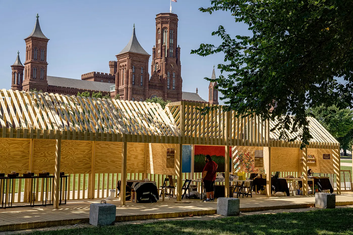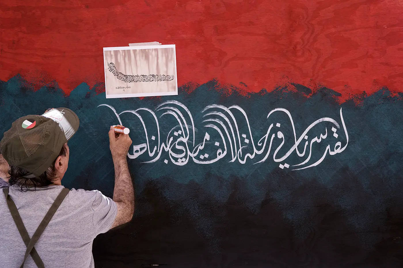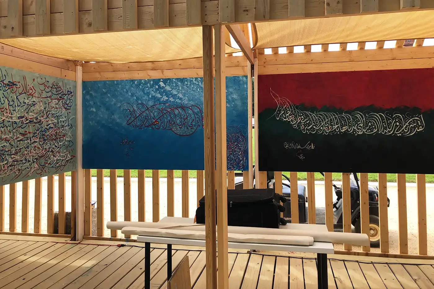 Calligraphy is one of the most important art forms that emerged from the Islamic world. It is an ancient display of the sacred in an artistic form, an adoration of the word of God. It also extends beyond the portrayal of religious content to portray messages from poets or revered leaders. The United Arab Emirates program site was directly across from the Smithsonian Castle on the National Mall and within the Story Majlis, calligrapher Mohammed Mandi created four large calligraphies, each filling a full sheet of plywood with designs containing carefully selected messages.