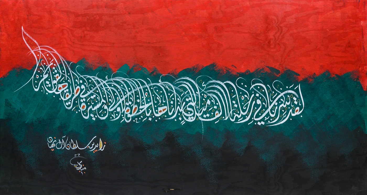 Though the two works highlighted in this entry may appear different at first glance, they complement one another through their content. The top, blue painting contains a quote attributed to George Washington: “My mother was the most beautiful woman I ever saw. All I am, I owe to my mother.” The red and green painting above reads: “We started our 1,000-mile journey with our first steps, and we are on the right path,” a quote from Sheikh Zayed bin Sultan Al Nahyan, the first president and founder of the UAE. With these calligraphic paintings, Mandi has drawn a parallel between the founding fathers of the United States and the Emirates, forging a connection between American history and Islamic art.
