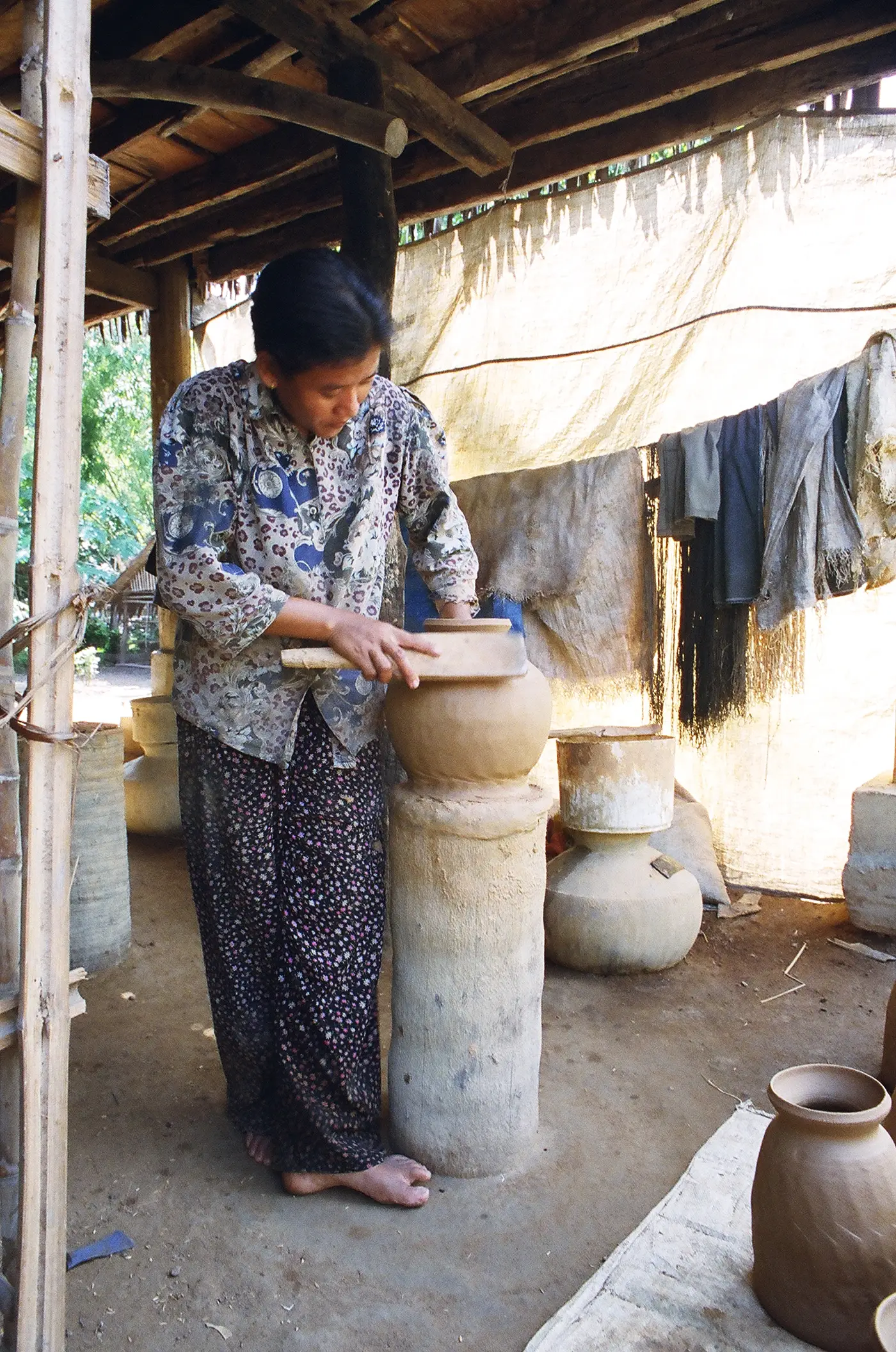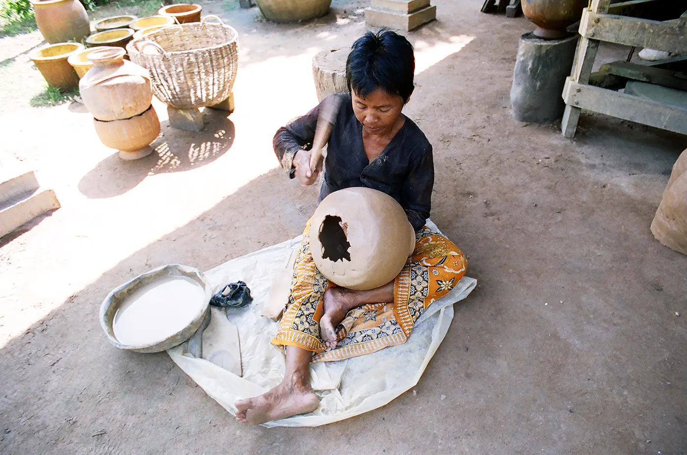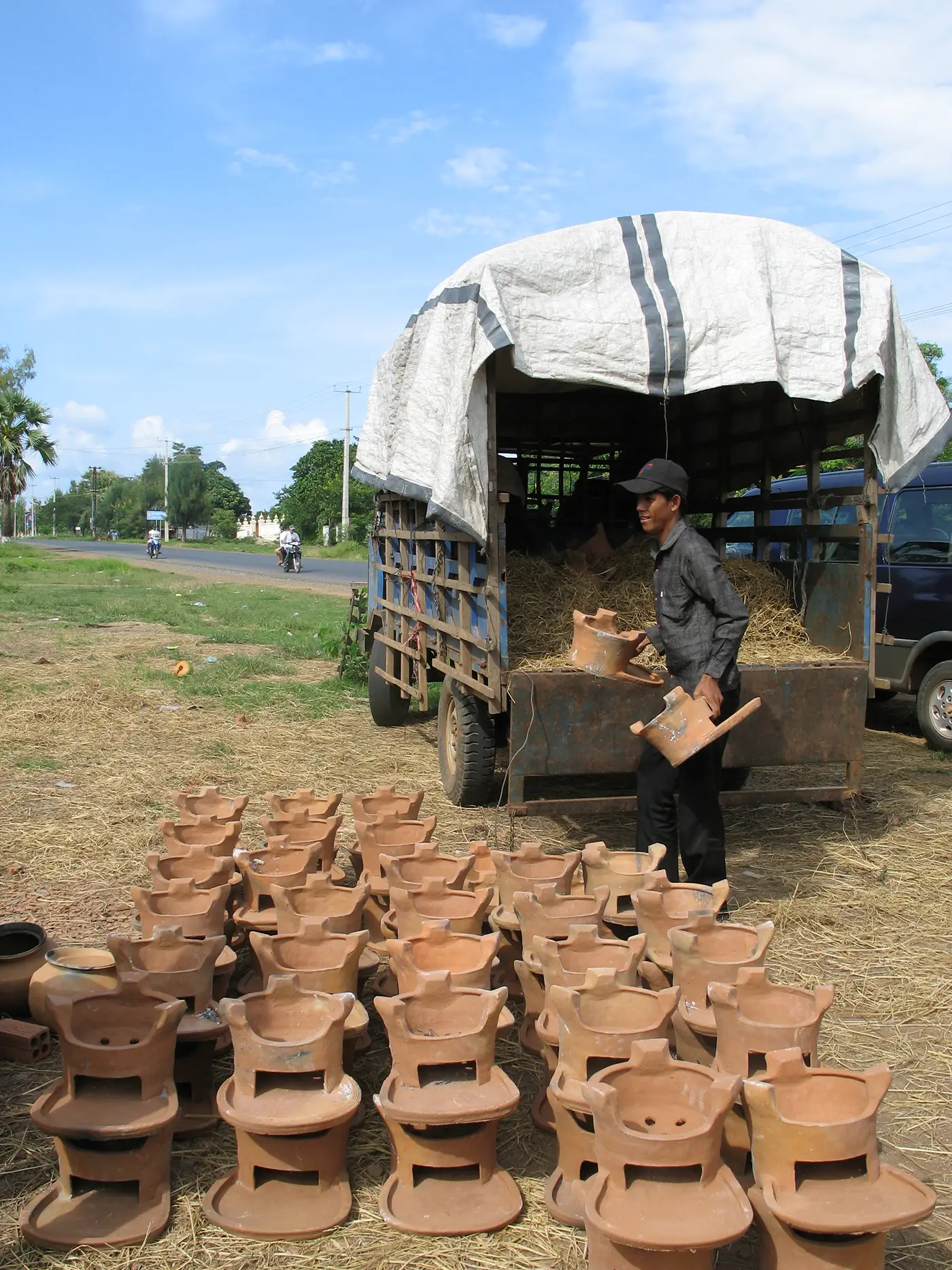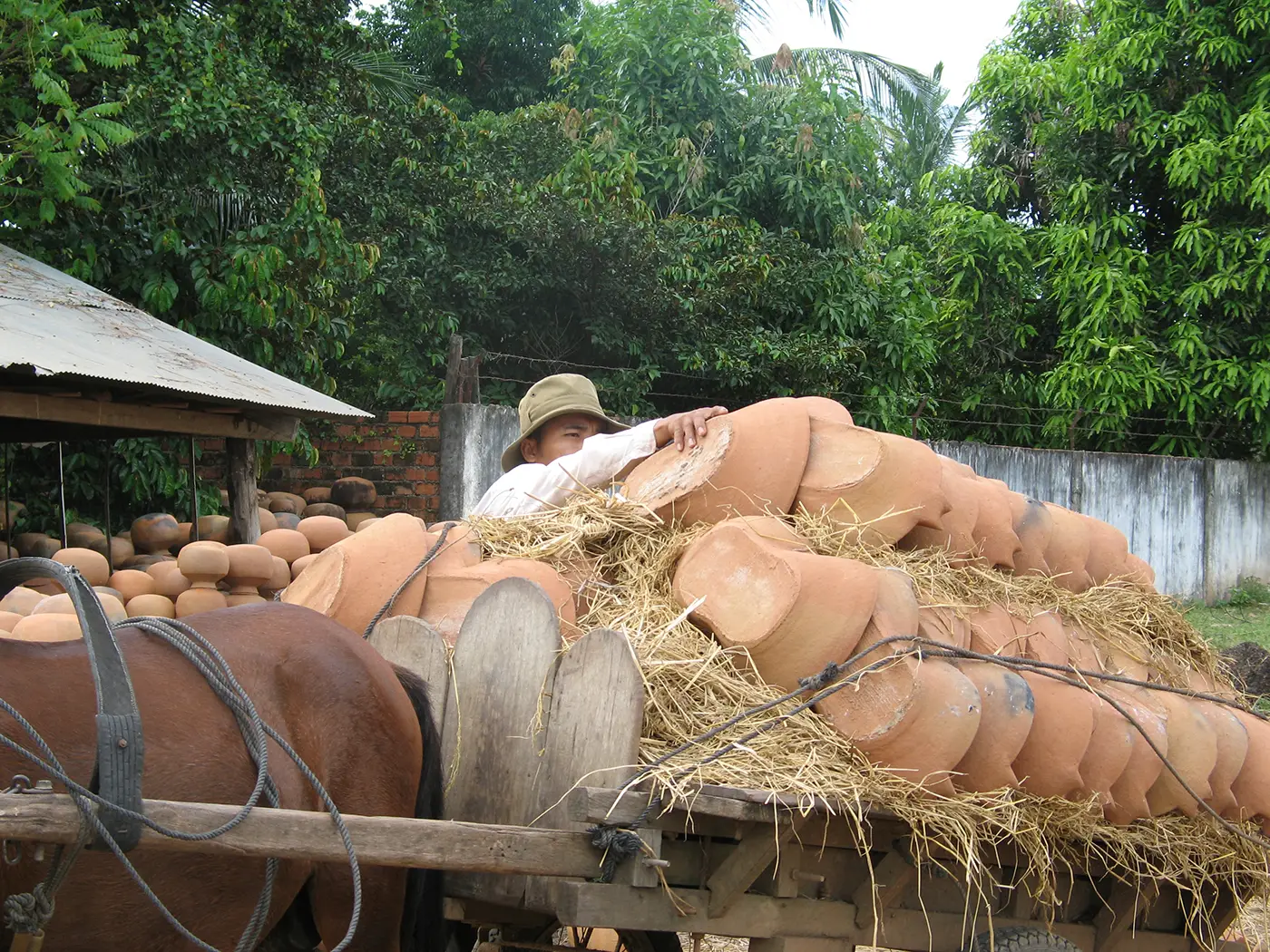 While women are the pottery producers, it is their husbands and brothers who carry the goods to market, setting out on selling trips that might take them to the farthest corners of Cambodia or beyond. Some enterprising families now take pots to buyers on trucks, but the ware is usually first loaded onto a cart drawn by horse or ox before several cartloads are consolidated onto a truck. The vendors who set out from the village to sell pots return weeks later with news of the outside world, ideas for new products, and feedback from customers so that ongoing production can respond to market demands.