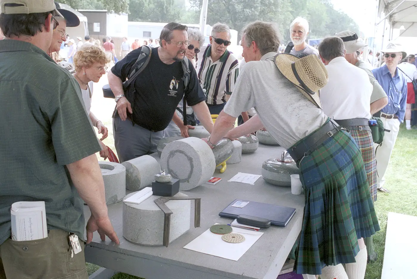 Curling was featured at the 2003 Festival as one of two traditional sports closely associated with Scotland (the other is golf). Program curator Nancy Groce noted that the curling tent was always crowded. Not only was there a mock ice rink (made of vinyl; real ice would have melted in the summer heat) but Kays of Scotland, which has been making curling stones since 1851, sent literally tons of granite in varying stages of cut and polish to illustrate the manufacturing steps. Two of their top employees, twins James and Russell Wyllie, discussed the process, the special qualities of the granite, and demonstrated the techniques and strategy of the game.