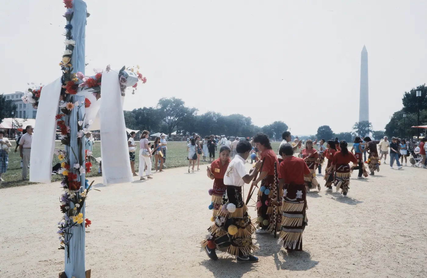 The ritual dance troupe followed a decorated cross down the National Mall, forming dance patterns in time to the persistent rhythms of the accordion and drum. The ringing bells and clanging reeds on the nagüillas accentuated the sounds. Each dancer also shook a gourd rattle. The cadence of the music and energetic stepping drew visitors from across the Festival who eagerly followed the procession.