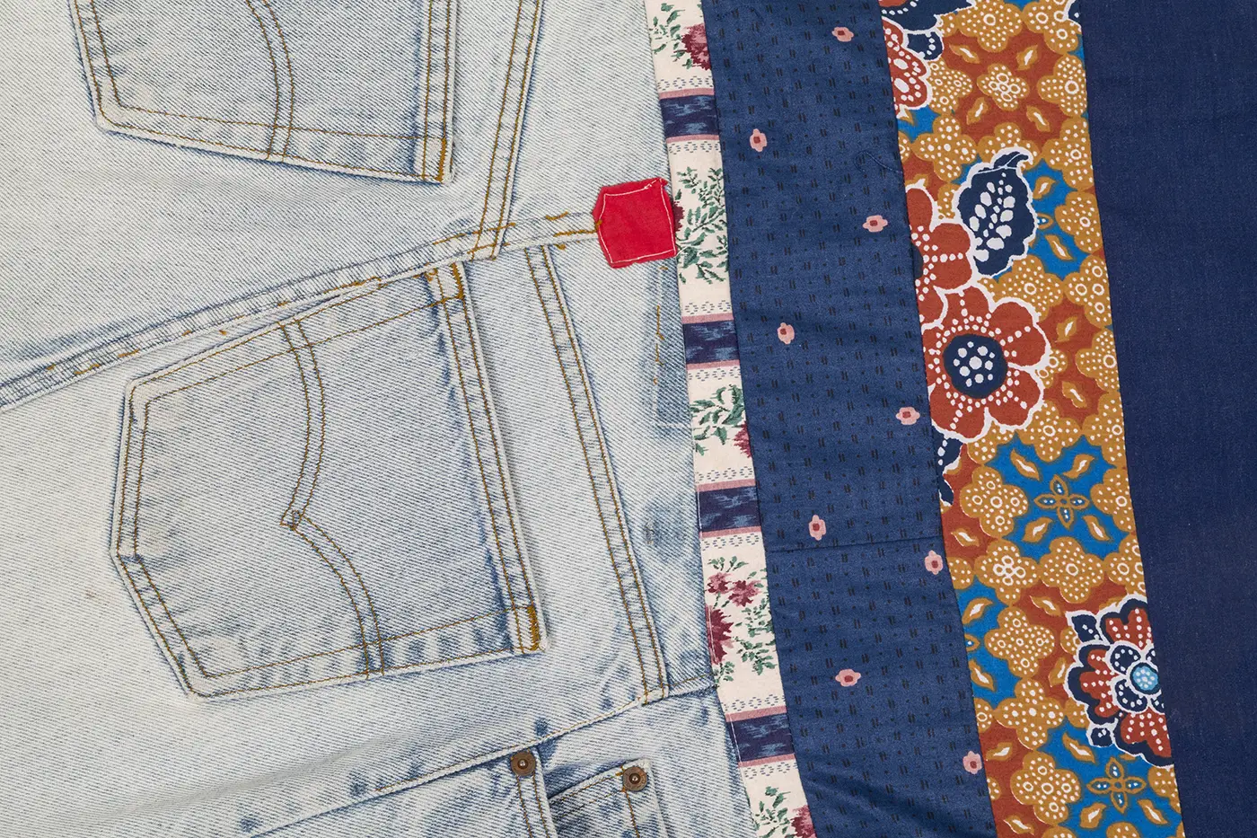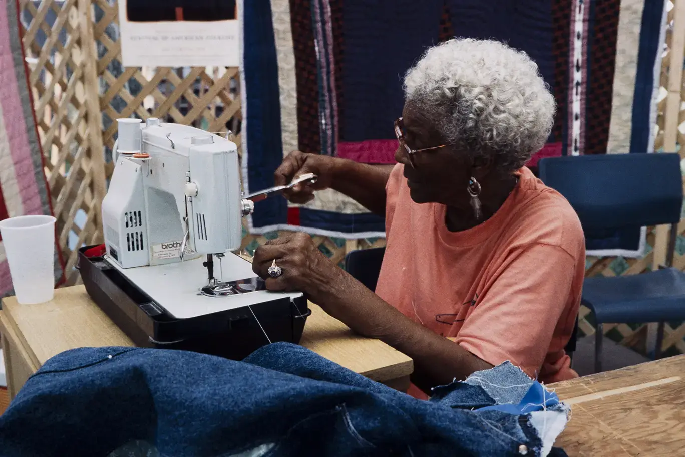 Before and during the Festival, we work especially closely with craftspeople to try to ensure the best presentation possible on the Mall, with appropriate supplies, materials, space, and context. Arbie had told us that she would like to make a quilt using pants, one of the many types of quilts she was known for and one that touched on repurposing materials. We had our work cut out for us to make sure she had a sewing machine, the right colors of thread, adequate workspace, and a backdrop to show off some of her completed work. And then there was the question of where to get the pants. Not being one to pass up an opportunity to clean out my closet, I happily surrendered an old pair of jeans to this great cause.