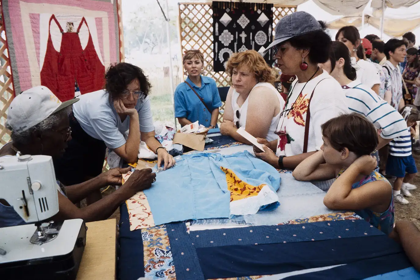 Visitors to Arbie’s tent learned that she grew up in rural Carthage, Texas, and that she learned to sew from her mother, an expert quilter, when she was eight years old. She married young and raised nine children, working at various jobs to help support her family. She moved to California with her family in the 1940s and revived quilt making as her children grew older. She was influenced by other Southern quilters in her use of bright colors, vibrant contrasts, and geometric patterns. She also used her own creative aesthetics to incorporate “accidents” and irregularities into her pieces, putting her unique mark into each quilt.