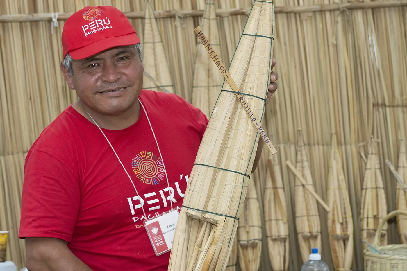 As visitors approached the Caballitos de Totora exhibition space at the 2015 Perú: Pachamama Festival program, they were confronted by ten- to fifteen-foot-tall reed rafts, standing just as they would on the beaches of Huanchaco. The totora reeds (bulrush), from which the caballitos were constructed, carried the smell of the northern Peruvian coast. In my mind I was transported back to the day I met fisherman and master caballito maker Ángel Piminchumo and his nephew Matteo Valderrama.