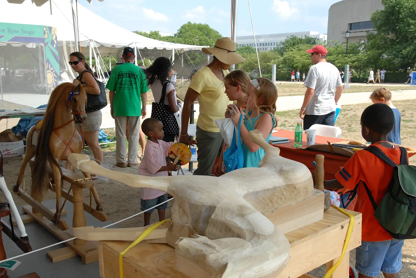 Roots of Virginia Culture marked the 400th anniversary of the founding of Jamestown. By looking at the roots of Virginia’s historic settlement and later growth, Festival organizers and participants took on a particularly big challenge that year. Curator Betty Belanus noted that the first Englishmen who stepped foot on the continent had come looking for a quick route to riches. Instead, they put in motion the creation of a new country set to be shaped by many different cultural traditions. By looking at the Native American, English, and African American roots of Virginia culture, the program brought participants from Kent, England, and Senegal, West Africa. A wide range of arts and cultural practices were presented side by side so visitors could note the similarities and differences.
