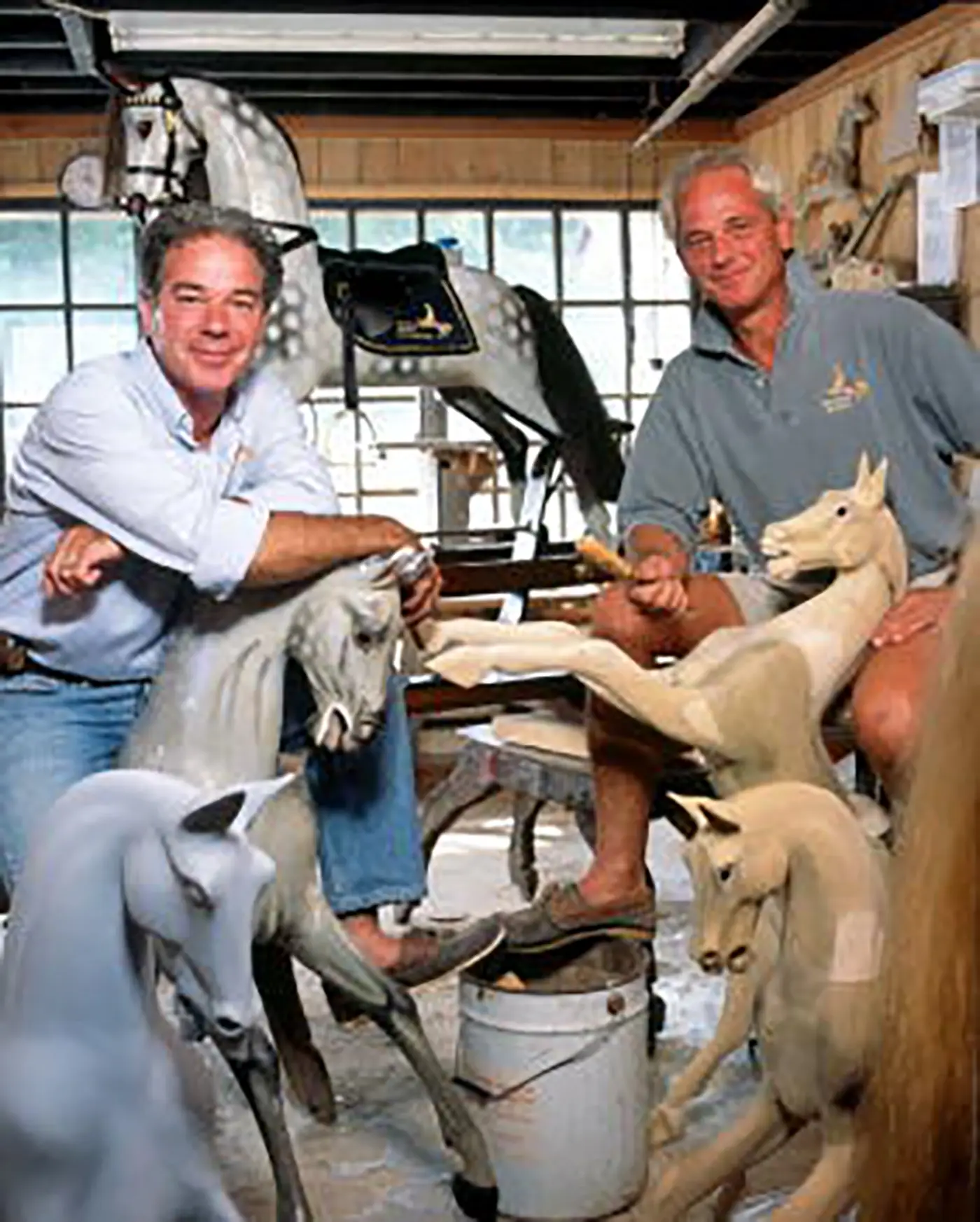 Twin brothers Tony and Marc Stevenson of Bethersden, Kent, came to their business of creating and selling rocking horses through family. Born overseas, they had seen rocking horses made by their uncle on visits home and secretly hoped to be given one when their family returned to England. The gift never came, but when the brothers decided to go into business together, they followed in their uncle’s footsteps. They have now been crafting exquisitely beautiful horses for more than thirty years—including for members of the royal family.