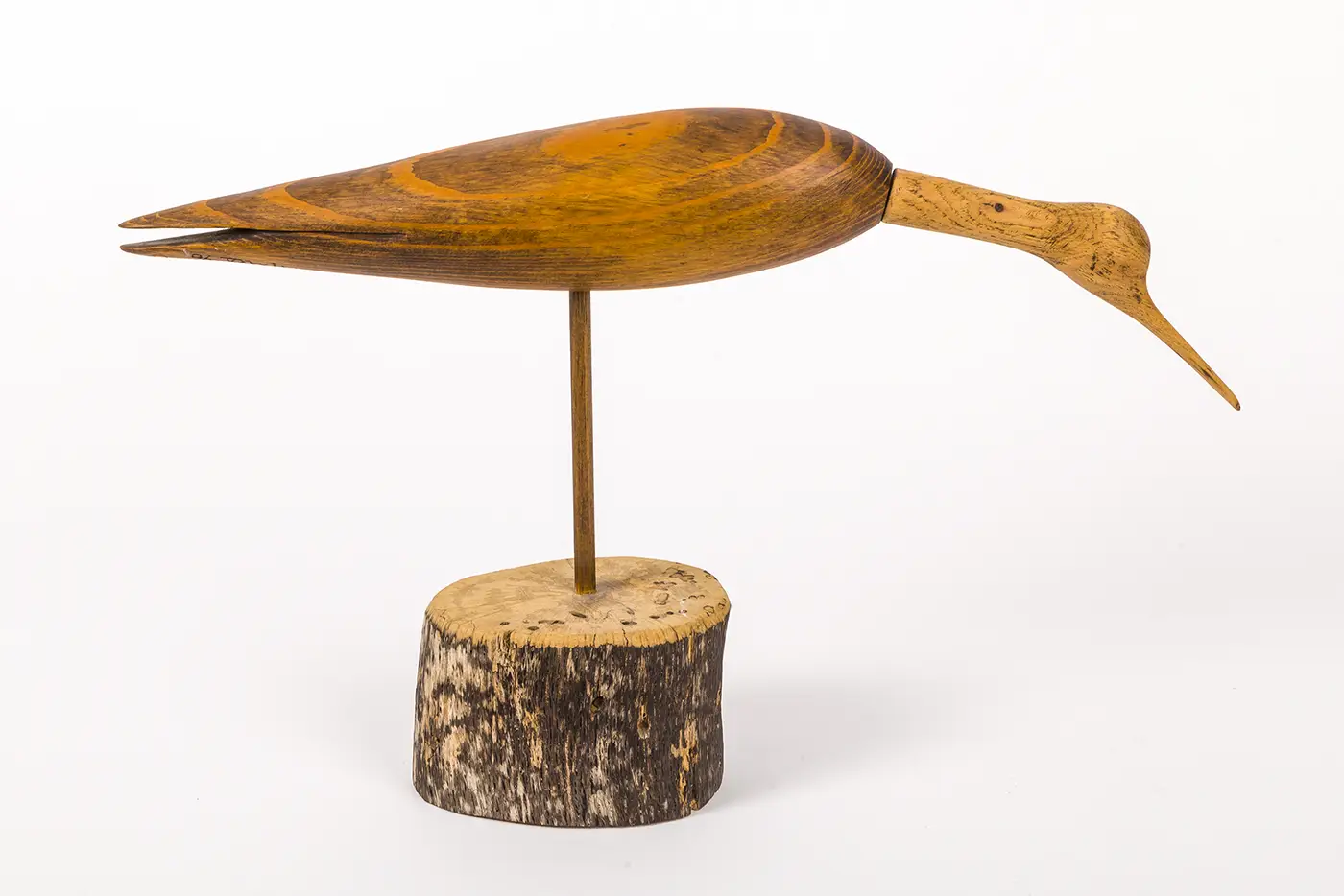 Ernie Mills learned to whittle from his grandfather at the age of seven. He went on to help his father rough out silhouette decoys to attract ducks and geese flying over the fields outside Bombay Hook Refuge, Delaware. Folklorist and longtime friend John Burrison describes the varied types of carvings Mills has mastered as ranging from “working decoys” for hunting to decorative “mantel carvings” for display and miscellaneous forms such as the “roothead shorebirds” shown here.