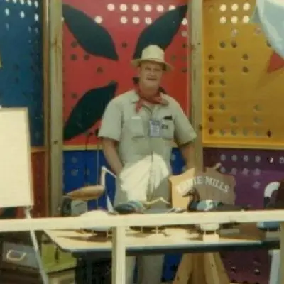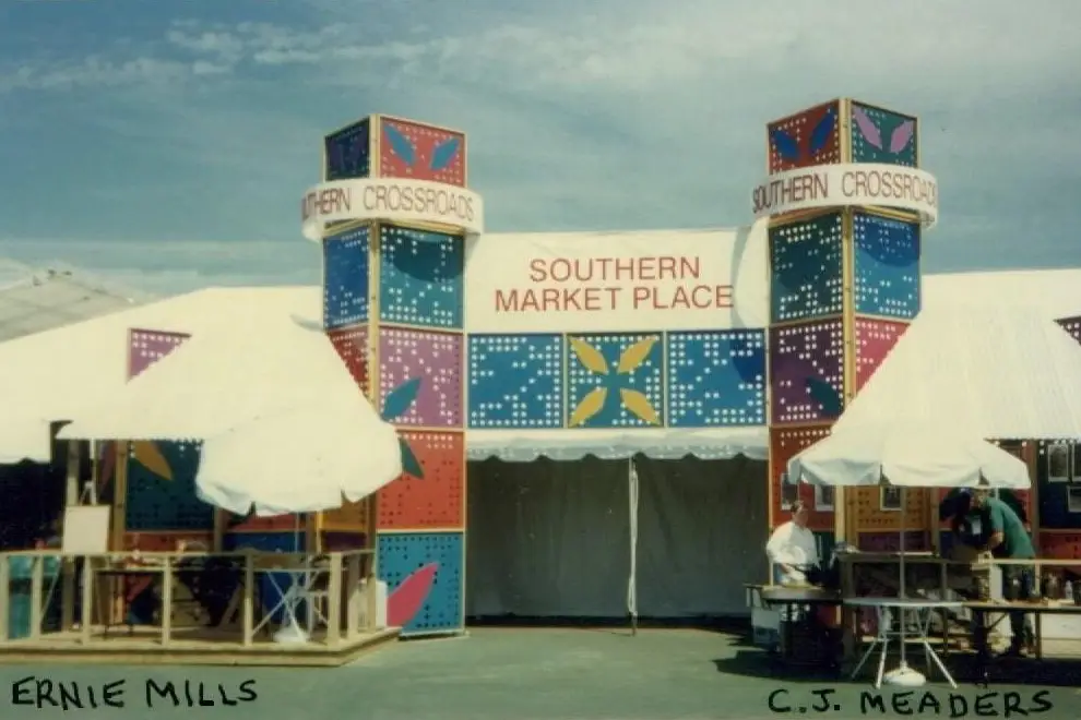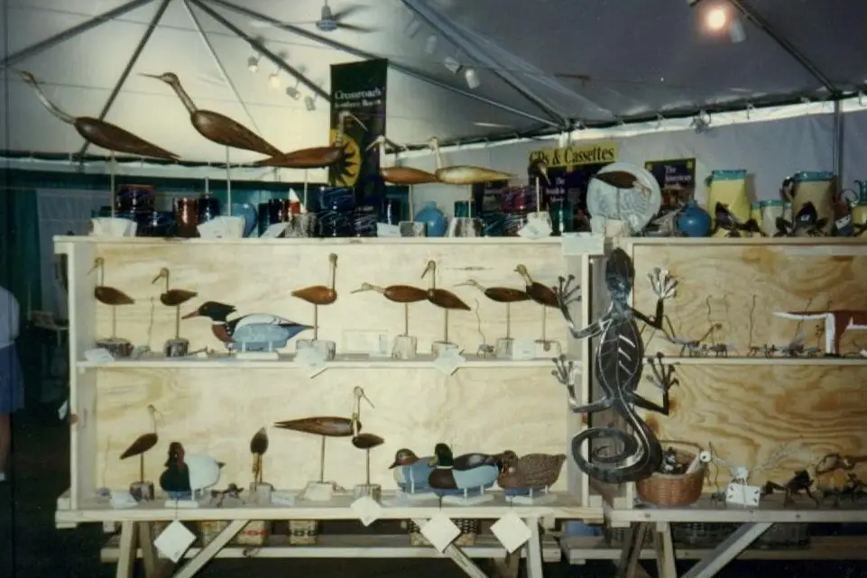 At the Olympic Arts Festival, Mills was paired with Georgia potter CJ Meaders during the opening week, working in adjacent booths flanking the marketplace entrance. In preparation, Mills brought seven blocks of wood to chop into bird form, using a small axe to rough out the body shape. He then carved and attached a head and invited children to take turns with the sanding bow. On some days, as many as 200 lined up to help. When finished, the young sanders signed their names, and by the end of the week, Milles and his visitors had carved seven new canvasback duck decoys.