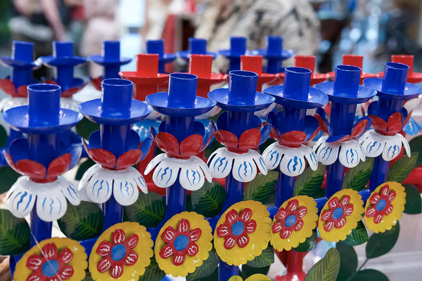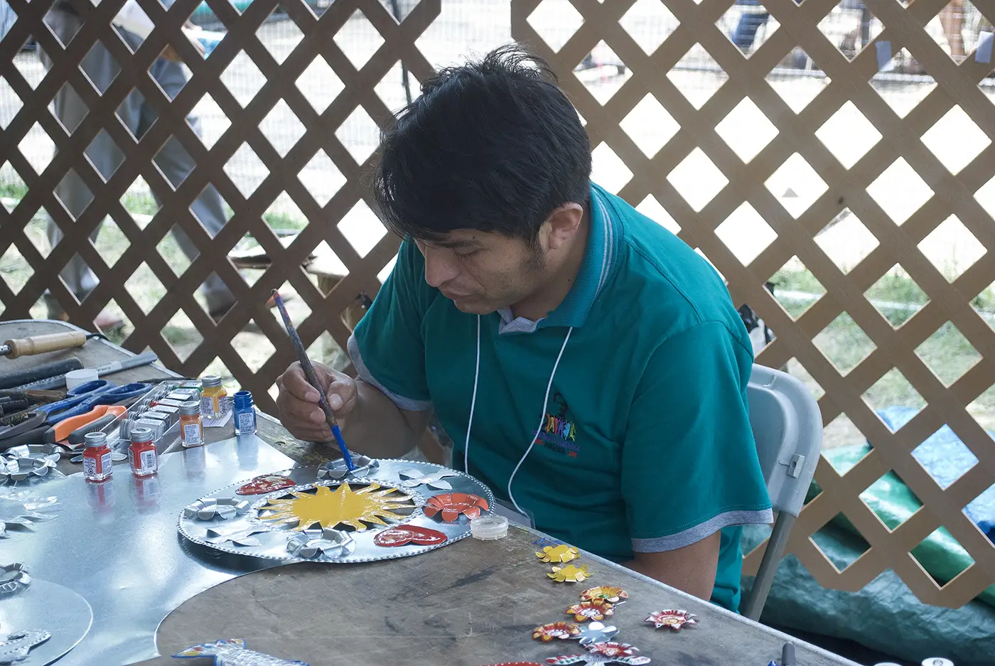 Decorative tinwork is well known in Mexico but less so in Peru. Jang Ludmir Araujo Ayala stressed this point frequently as he demonstrated his techniques during the Perú: Pachamama program. Ayala learned to work in metal from his father, who had him start by making utilitarian objects such as buckets and candelabras. He eventually incorporated decorative motifs from the wood and plaster retablos—storytelling shrines—made by his mother. In so doing, he creatively joined together two distinct craft forms to make a third that is rich in three-dimensional decoration and color.