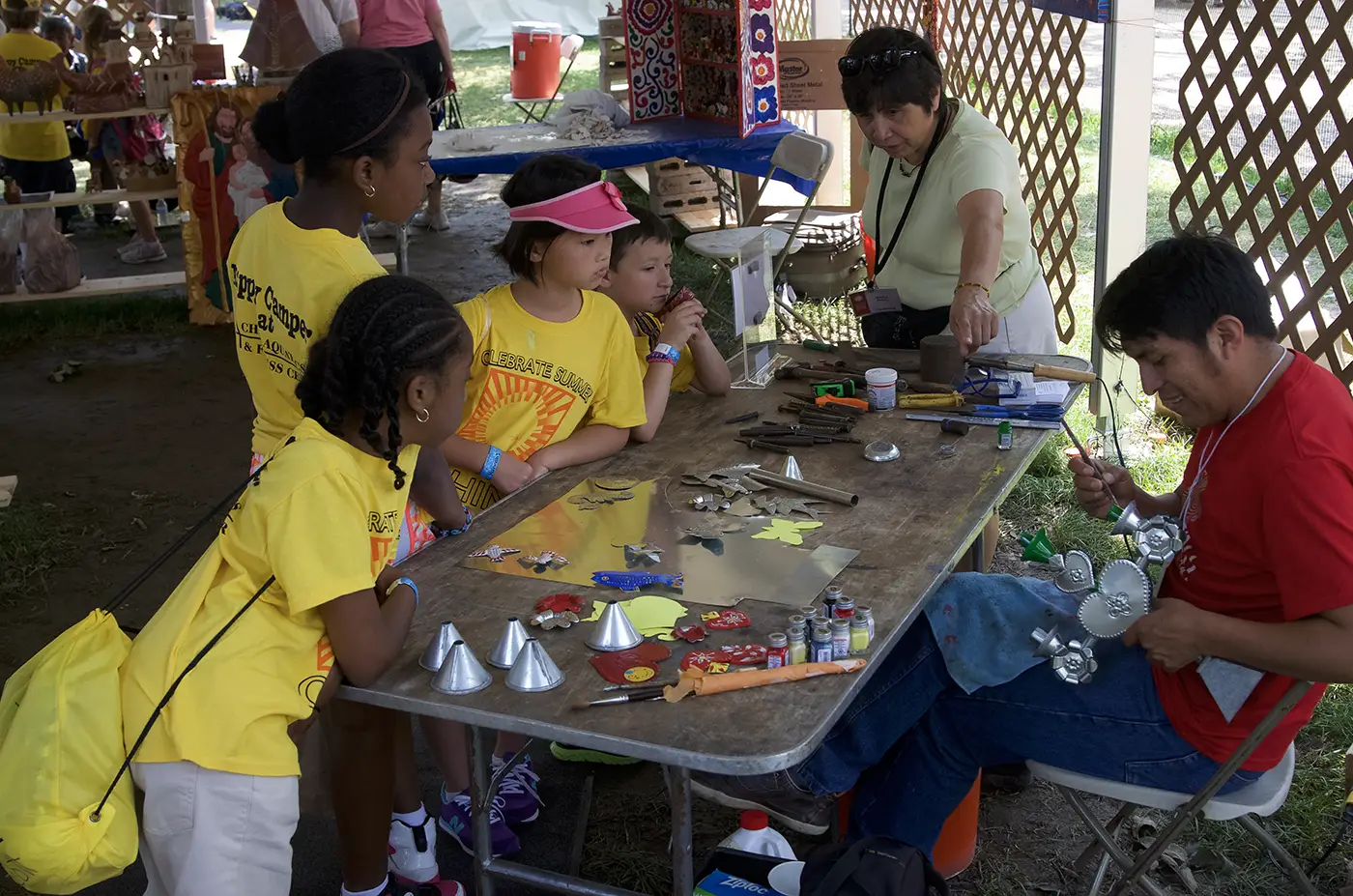 Ayala worked on this decorative plaque throughout the Festival, intending to present it to program curator Olivia Cadaval on the last day. Each design took on special meaning for him, with the Smithsonian sunburst logo standing in for his time in Washington, D.C. The spread-winged birds at the top and bottom are white doves of peace tying together our cultures and countries, the hearts symbolize the warm feelings he developed for the Festival, and the flowers symbolize the beauty of summertime in his homeland, Peru—perhaps denoting a bit of longing to return home.